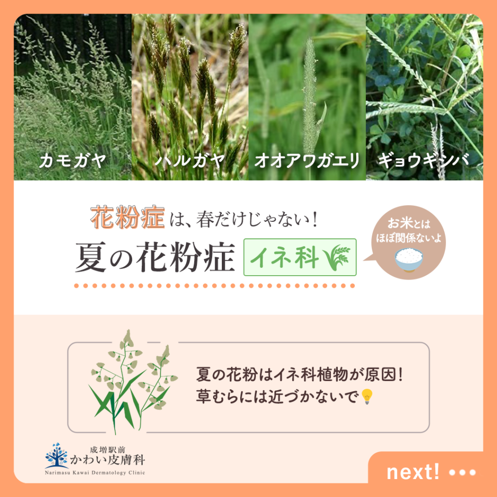 春花粉が終わって夏になっても「くしゃみ」「鼻水」「目のかゆみ」など花粉症状がある場合は、イネ科花粉症が疑われます。