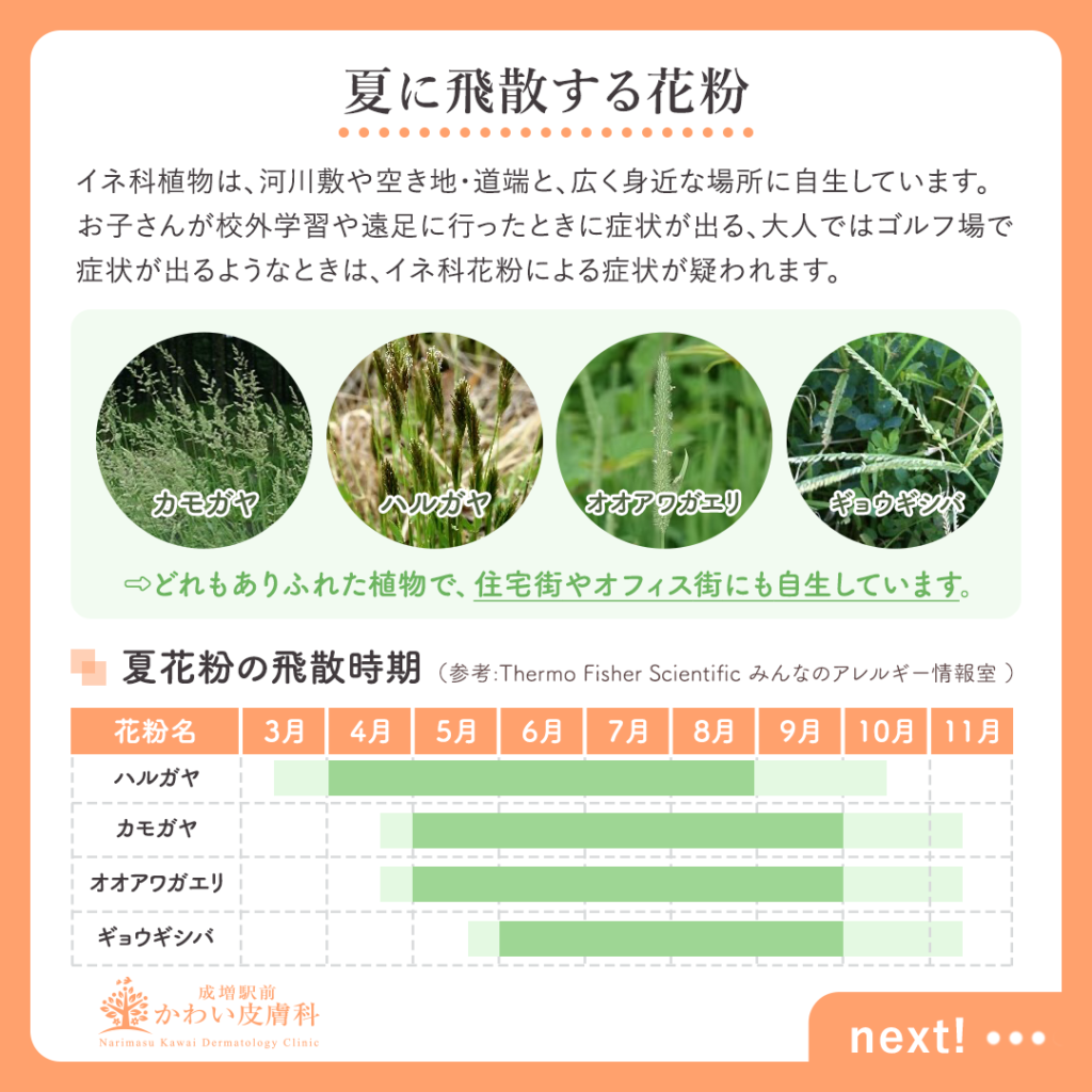 夏花粉の代表的な植物は、カモガヤ、ハルガヤ、オオアワガエリ、ギョウギシバなどです。どれもありふれた植物で、住宅街やオフィス街にも自生しています。子供が遊ぶ場所に多く自生しているため、子供の患者が多い傾向があります。