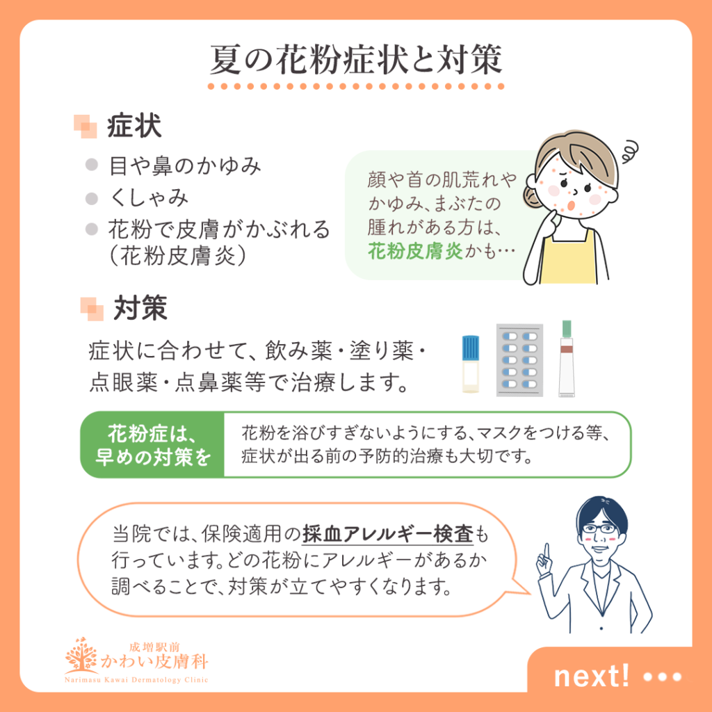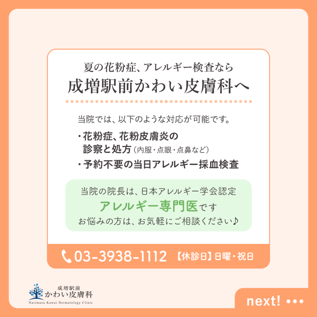 夏の花粉症、アレルギー検査なら成増駅前かわい皮膚科へ